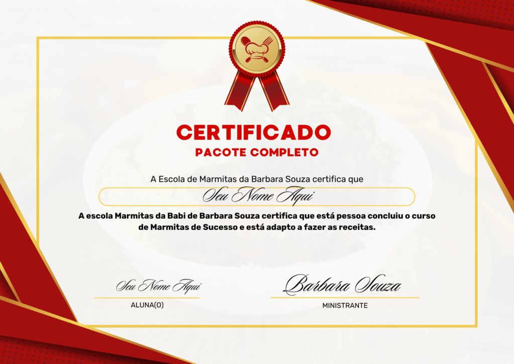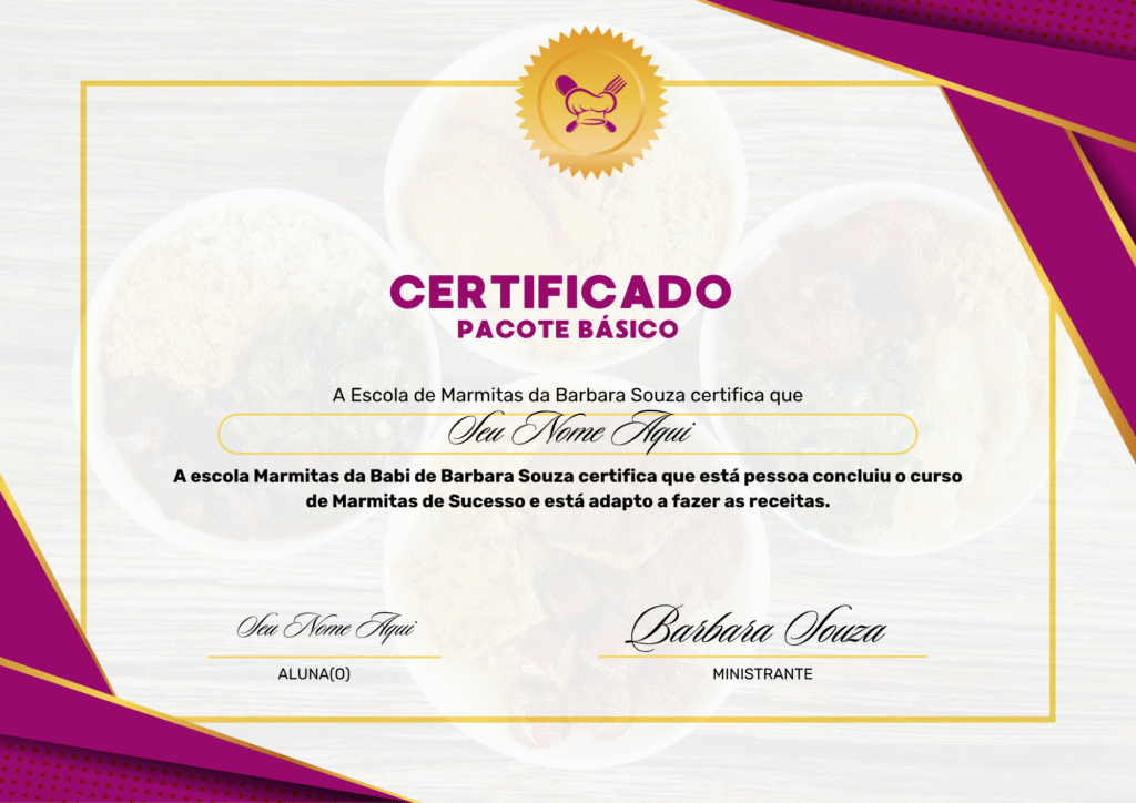Ao concluir, você receberá o seu certificado personalizado, com a merecida aprovação de competência, pronto para ser impresso e exposto em Restaurante ou na sua Casa!